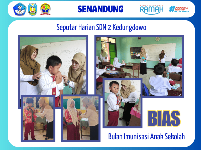 SDN 2 Kedungdowo bekerja sama dengan tim kesehatan dari Puskesmas Arjasa telah melaksanakan kegiatan Bulan Imunisasi Anak Sekolah (BIAS) dengan lancar. Kegiatan ini merupakan program rutin dari Kementerian Kesehatan yang bertujuan untuk melindungi anak-anak usia sekolah dari berbagai penyakit yang dapat dicegah dengan imunisasi.